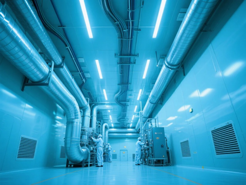 智能化控制:集成環(huán)境監(jiān)測(cè)系統(tǒng),實(shí)時(shí)顯示溫濕度、壓差及粒子濃度數(shù)據(jù),聯(lián)動(dòng)空調(diào)機(jī)組自動(dòng)調(diào)節(jié),確保工藝環(huán)境穩(wěn)定。設(shè)備區(qū)采用不銹鋼圍擋,并設(shè)置黃光防眩照明,減少光學(xué)干擾。整體設(shè)計(jì)兼顧潔凈效能、耐久性與智能化管理,滿足半導(dǎo)體制造的高標(biāo)準(zhǔn)要求。