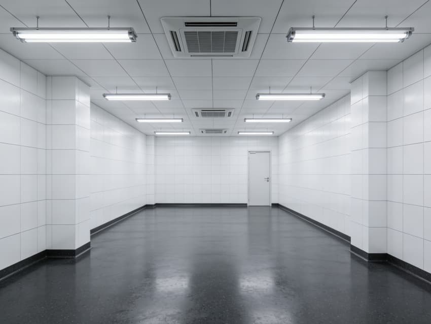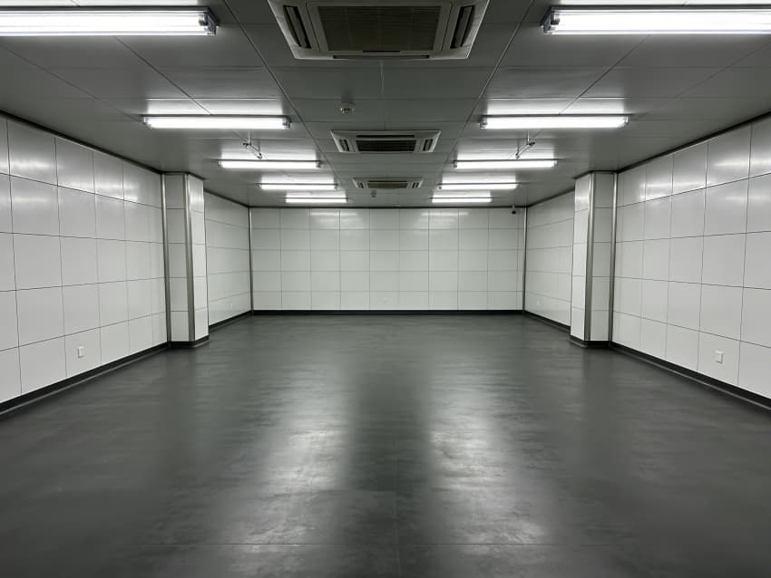 車間內(nèi)部施工工藝凸顯耐腐潔凈特性:地面采用深灰色重防腐環(huán)氧自流平工藝,經(jīng)基層噴砂處理、防腐底漆涂刷、環(huán)氧砂漿找平、自流平罩面四道關(guān)鍵工序,表面平整度誤差≤1mm/m,耐酸堿、耐有機(jī)溶劑腐蝕,附著力達(dá)2.0MPa以上;墻面采用白色食品級(jí)潔凈抗菌涂層施工,推行無(wú)縫拼接技術(shù),陰陽(yáng)角采用R50圓弧倒角工藝,杜絕積塵死角,涂層硬度達(dá)2H,可耐受高頻次消殺。