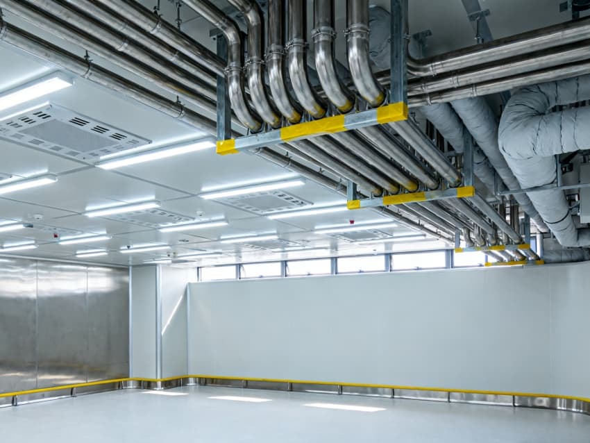潔凈度需達(dá)到千級(jí)標(biāo)準(zhǔn),采用“上送側(cè)排”的氣流組織形式,頂部安裝FFU風(fēng)機(jī)過濾單元,地面鋪設(shè)防靜電PVC卷材,墻面使用密封彩鋼板,最大限度減少靜電對(duì)精密元件的干擾。?
