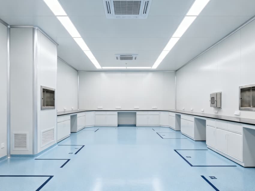 內(nèi)部6個(gè)實(shí)驗(yàn)室均為無(wú)設(shè)備空曠布局,按萬(wàn)級(jí)潔凈標(biāo)準(zhǔn)建設(shè):地面鋪設(shè)無(wú)縫抗菌環(huán)氧自流平,墻面采用食品級(jí)不銹鋼潔凈墻板,陰陽(yáng)角做R40圓弧處理杜絕積塵死角;柱網(wǎng)間距設(shè)為7.5米,預(yù)留實(shí)驗(yàn)臺(tái)、精密檢測(cè)設(shè)備安裝點(diǎn)位及運(yùn)維通道;頂部整合高效新風(fēng)過(guò)濾系統(tǒng)、恒溫恒濕裝置與防眩光LED照明,所有管線暗藏于吊頂內(nèi),最大化釋放空間高度與視野;實(shí)驗(yàn)室間通過(guò)通透玻璃隔斷銜接,進(jìn)一步強(qiáng)化整體空曠感,為藥物合成、質(zhì)量檢測(cè)等核心研發(fā)環(huán)節(jié)提供安全、潔凈的專(zhuān)屬環(huán)境。