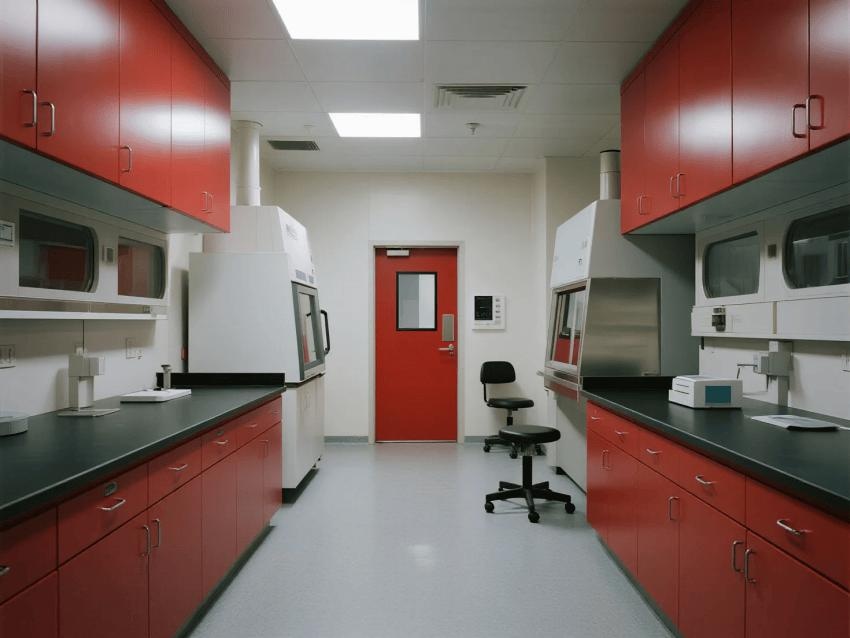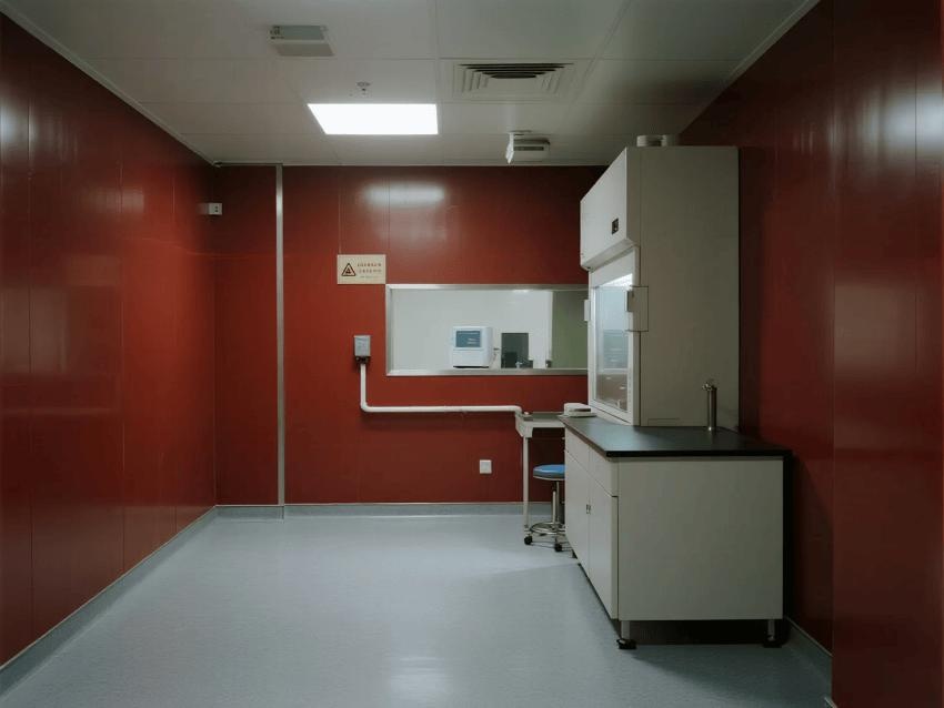 視覺警示:深紅墻體搭配黑色安全標(biāo)識,強(qiáng)化生物危險(xiǎn)警示效果。