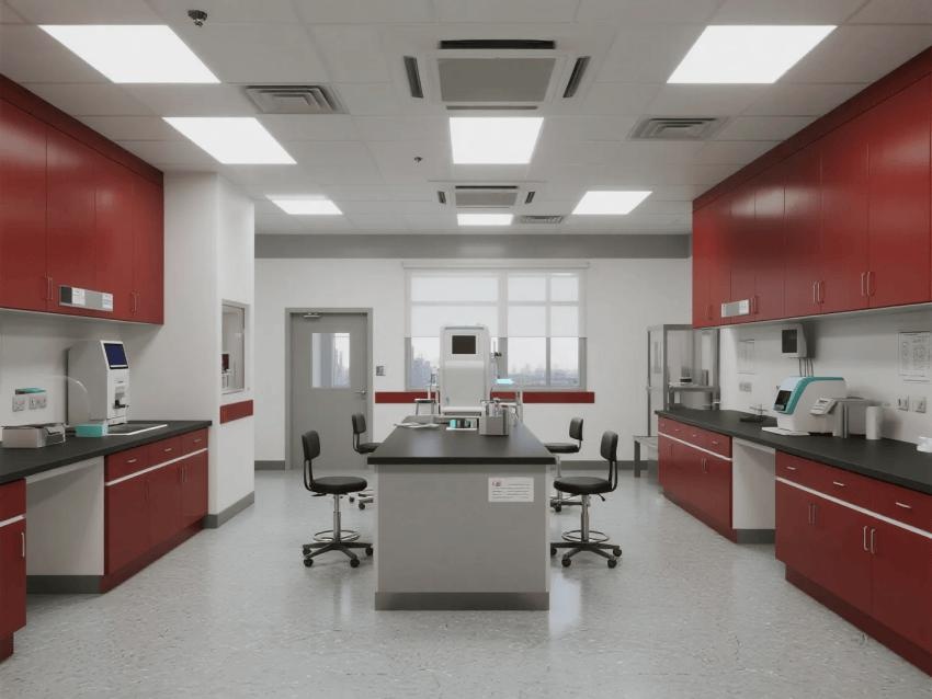 本實(shí)驗(yàn)室嚴(yán)格遵循BSL-3級生物安全標(biāo)準(zhǔn),通過深紅彩鋼板與淺灰環(huán)氧地坪的強(qiáng)烈視覺對比,構(gòu)建安全高效的病原體研究空間。