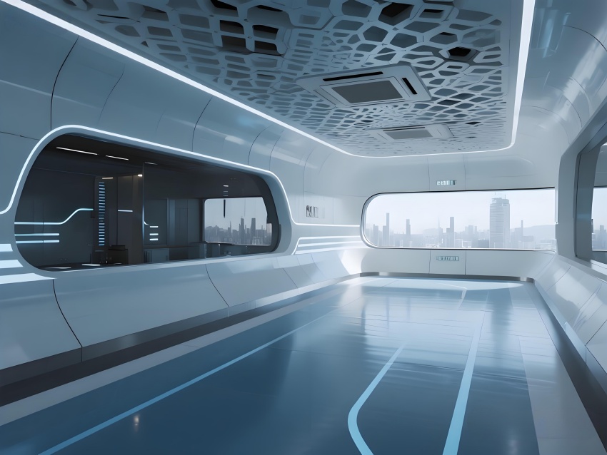 本車(chē)間空間以冰川藍(lán)與鈦白為主色調(diào),弧形墻角與無(wú)縫地坪構(gòu)成流暢的潔凈界面,頂部蜂窩狀FFU陣列形成科技感天花肌理。灌裝區(qū)透明亞克力防護(hù)罩展示自動(dòng)化生產(chǎn)線運(yùn)作,配合層流工作臺(tái)的紅色氣流可視化設(shè)計(jì),強(qiáng)化無(wú)菌核心概念。功能模塊通過(guò)地面灰色導(dǎo)視帶串聯(lián),設(shè)備區(qū)的鏡面不銹鋼與控制面板的藍(lán)色背光形成冷調(diào)光效。玻璃觀察窗嵌入電子壓差計(jì),走廊的漸變光環(huán)境引導(dǎo)系統(tǒng)在滿足GMP動(dòng)態(tài)監(jiān)測(cè)要求的同時(shí),營(yíng)造出未來(lái)實(shí)驗(yàn)室般的專業(yè)氛圍,緩解員工長(zhǎng)時(shí)間密閉作業(yè)的疲勞感。