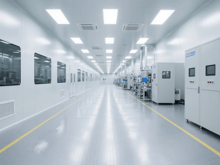 智能化配置:集成環(huán)境監(jiān)測(cè)與設(shè)備聯(lián)動(dòng)系統(tǒng),白色彩鋼板墻面嵌裝LED智能看板,實(shí)時(shí)顯示生產(chǎn)數(shù)據(jù)與潔凈參數(shù)。機(jī)械臂工作站配備藍(lán)光定位系統(tǒng),與金屬灰地坪形成科技視覺呼應(yīng)。