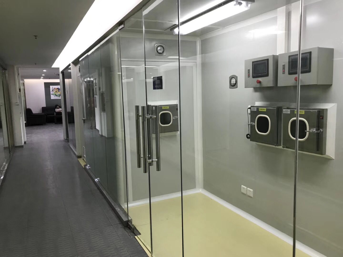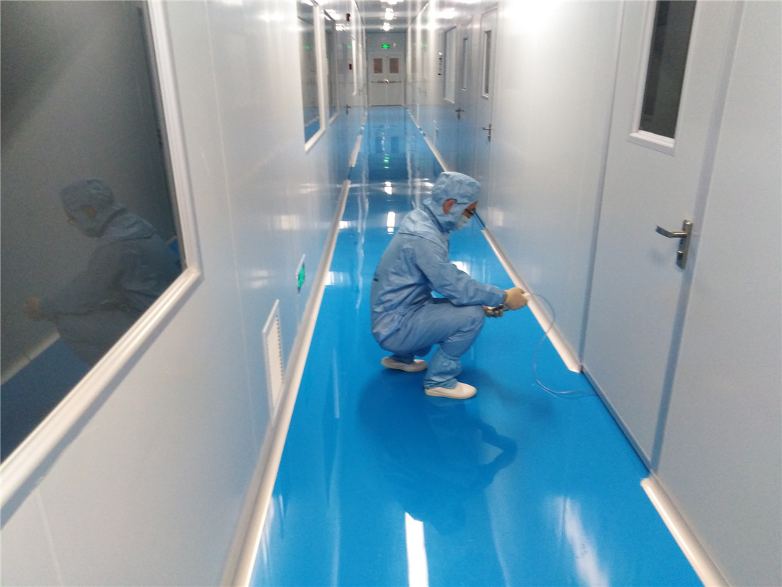 2)間隔:用雙面彩鋼保溫板圍護(hù)及間隔,圍護(hù)面到天花頂;潔凈走廊及車間間隔處做通透鋁合金半玻璃窗,窗臺(tái)高900mm,玻璃厚8mm,高1200mm,玻璃窗高平門高度(2100mm);鋁合金窗料用特制凈化材料,45?度斜邊,與地面及天花交角做元弧及陰角接口,符合規(guī)范及衛(wèi)生消毒要求。