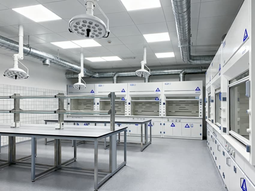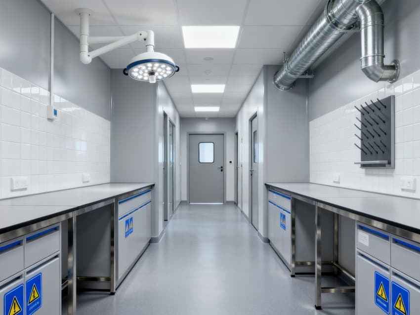 本生化研究實(shí)驗(yàn)室凈化工程嚴(yán)格遵循ISO7級(jí)潔凈標(biāo)準(zhǔn),將實(shí)驗(yàn)空間科學(xué)劃分為四大核心功能區(qū)域:樣品前處理區(qū)配備通風(fēng)櫥、震蕩儀等預(yù)處理設(shè)備,采用負(fù)壓設(shè)計(jì)防止交叉污染;試劑配制區(qū)設(shè)有獨(dú)立的天平室與超純水系統(tǒng),通過(guò)溫濕度智能調(diào)控系統(tǒng)將環(huán)境參數(shù)穩(wěn)定控制在±1℃與45%-60%RH;精密檢測(cè)區(qū)配置防震臺(tái)與電磁屏蔽裝置,可滿(mǎn)足高效液相色譜、質(zhì)譜儀等精密儀器的運(yùn)行需求;無(wú)菌操作區(qū)配備層流凈化工作臺(tái)與生物安全柜,配合動(dòng)態(tài)浮游菌監(jiān)測(cè)系統(tǒng),確保實(shí)驗(yàn)環(huán)境達(dá)到百級(jí)潔凈度標(biāo)準(zhǔn)。各功能區(qū)通過(guò)氣密式緩沖間與機(jī)械互鎖傳遞窗形成物理隔離,構(gòu)建起三級(jí)防護(hù)屏障。在保障蛋白質(zhì)分離純化、核酸提取擴(kuò)增等常規(guī)實(shí)驗(yàn)高效開(kāi)展的同時(shí),還專(zhuān)門(mén)設(shè)計(jì)了酶活性檢測(cè)專(zhuān)用恒溫恒濕實(shí)驗(yàn)室,采用獨(dú)立的凈化空調(diào)系統(tǒng)與UPS不間斷電源,可支持對(duì)環(huán)境參數(shù)高度敏感的高精度研究項(xiàng)目。此外,工程特別設(shè)置雙通道應(yīng)急處理系統(tǒng),包含緊急洗眼裝置、消防噴淋系統(tǒng)與防化物資儲(chǔ)備間,配合逃生路線(xiàn)熒光標(biāo)識(shí)與應(yīng)急照明系統(tǒng),全方位保障實(shí)驗(yàn)人員安全與科研數(shù)據(jù)完整。?