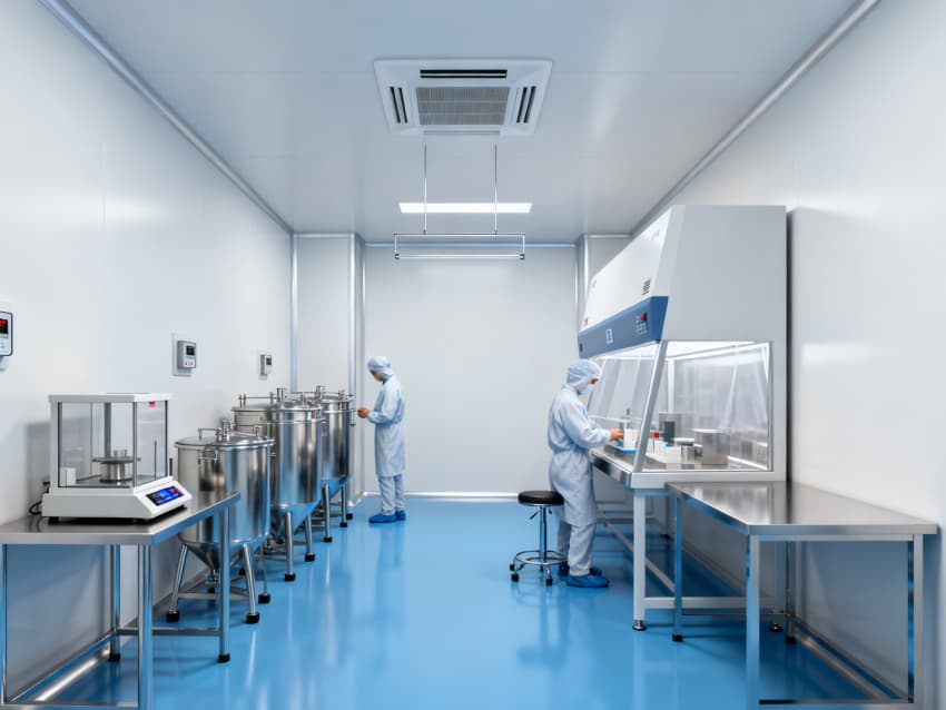 核心生產(chǎn)車間參數(shù)差異化設(shè)計(jì):原料處理車間為10萬級潔凈區(qū),配備初、中、高效三級過濾系統(tǒng),高效過濾器效率≥99.99%,送風(fēng)量2000m³/h;試劑配制車間達(dá)萬級潔凈標(biāo)準(zhǔn),采用頂送風(fēng)、側(cè)回風(fēng)模式,單向流風(fēng)速0.3-0.5m/s,溫濕度控制精度±2℃、±5%RH;無菌分裝車間為百級潔凈區(qū),配置層流罩,潔凈度≥0.5μm塵粒≤350個/m³,微生物≤1個/皿。