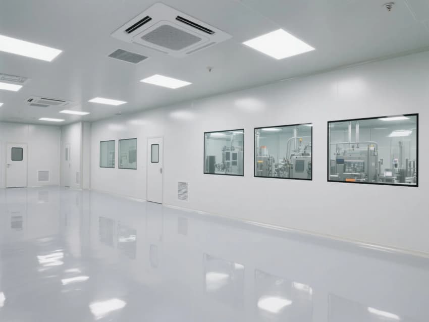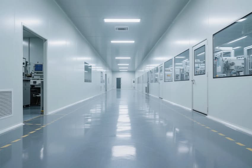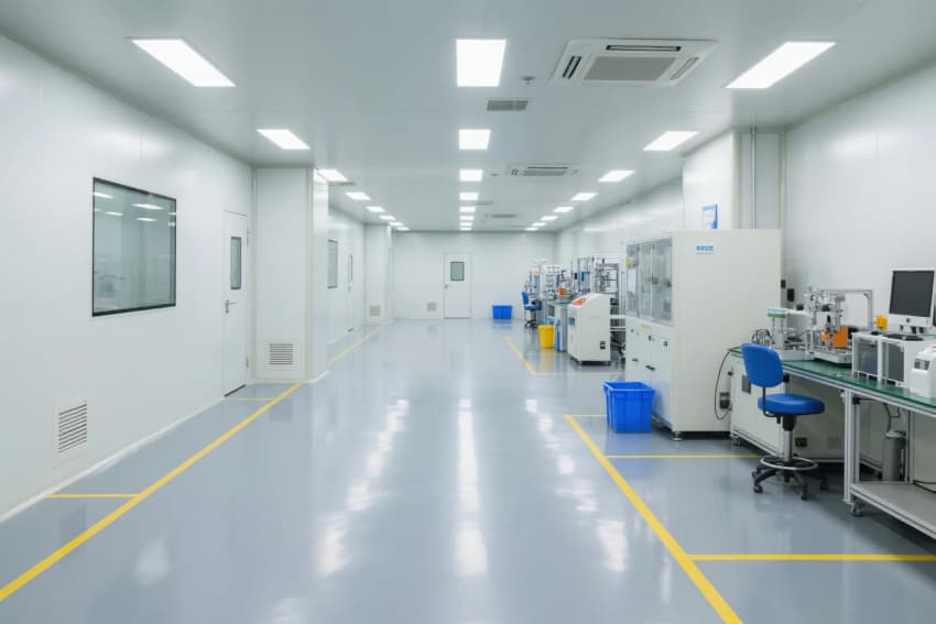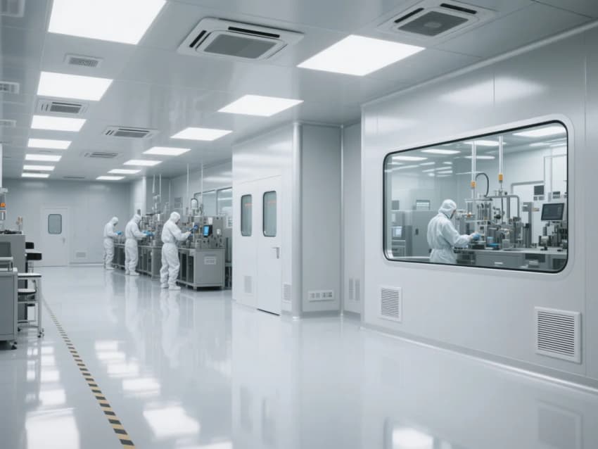 本工程嚴(yán)格依據(jù)ISO14644-1Class7潔凈標(biāo)準(zhǔn),采用"工業(yè)4.0"設(shè)計理念,打造智能化電子光伏生產(chǎn)環(huán)境。主體結(jié)構(gòu)采用模塊化潔凈室系統(tǒng),50mm厚深灰抗菌彩鋼板墻體與淺灰防靜電環(huán)氧自流平地坪形成未來工業(yè)美學(xué)基調(diào),表面電阻穩(wěn)定控制在10^6-10^9Ω范圍。