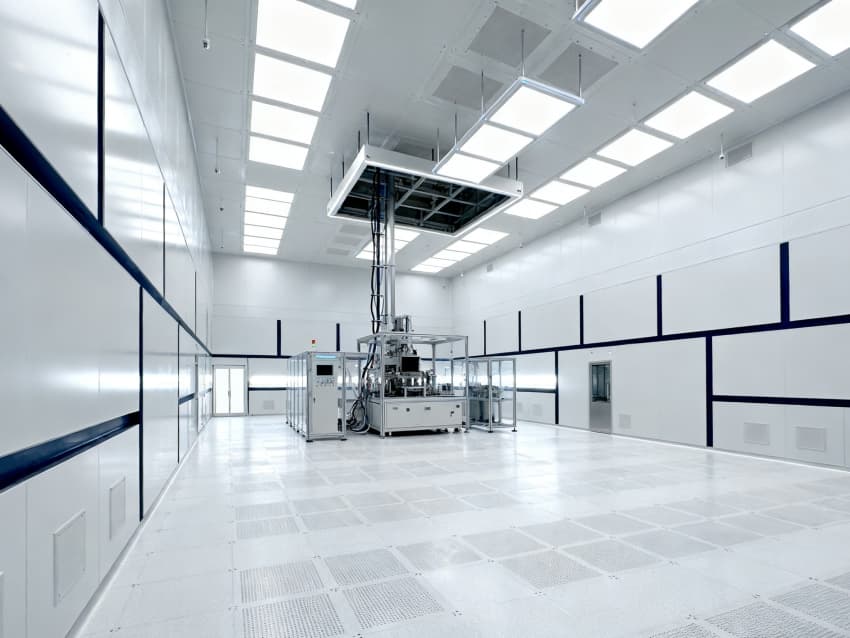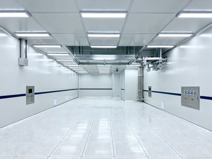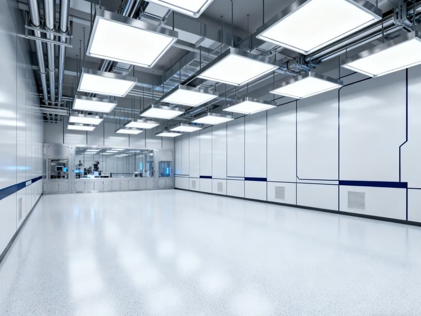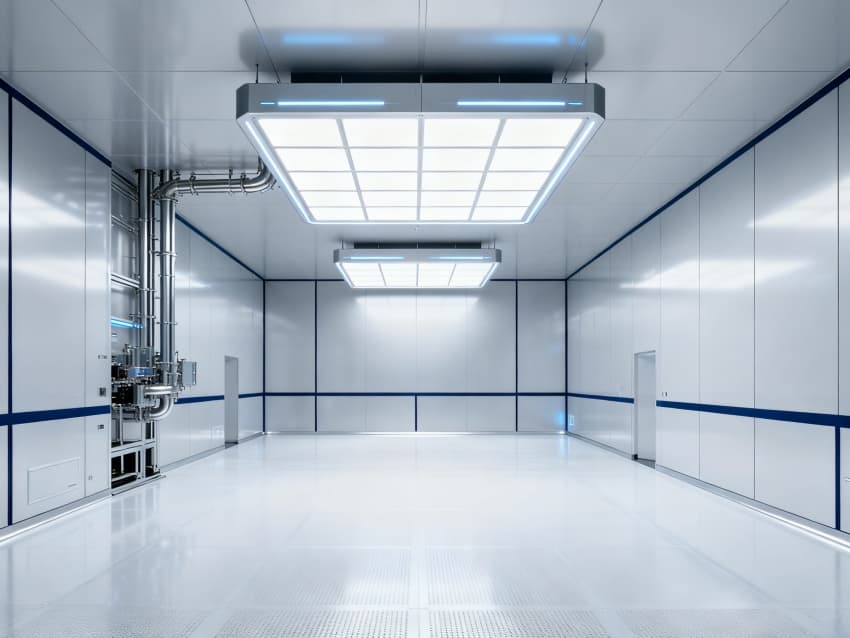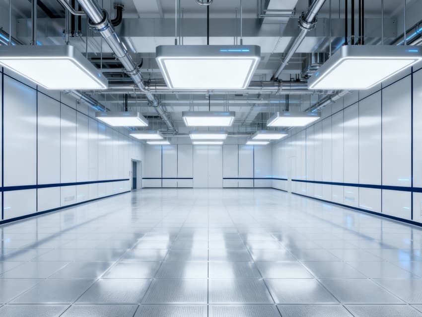 內(nèi)部6個(gè)量子車間均為無設(shè)備空曠布局,按千級潔凈標(biāo)準(zhǔn)與防電磁干擾要求建設(shè):地面鋪設(shè)防靜電環(huán)氧自流平,墻面采用無磁不銹鋼潔凈板,陰陽角做R50圓弧處理;柱網(wǎng)間距設(shè)為8米,預(yù)留充足設(shè)備安裝與運(yùn)維空間;頂部整合恒溫恒濕系統(tǒng)、高效送風(fēng)口及防眩光LED照明,設(shè)備管線暗藏設(shè)計(jì),進(jìn)一步強(qiáng)化空間空曠感,為量子芯片測試、量子傳感研發(fā)等場景提供穩(wěn)定、潔凈的專屬環(huán)境。