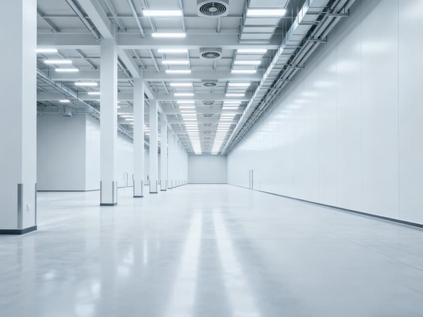 內(nèi)部6個生產(chǎn)車間均為無設(shè)備空曠布局,按工業(yè)級潔凈與承重標(biāo)準(zhǔn)建設(shè):地面鋪設(shè)耐磨防靜電環(huán)氧地坪,墻面采用白色環(huán)保潔凈墻板,陰陽角做圓弧處理減少積塵;柱網(wǎng)間距達(dá)10米,預(yù)留設(shè)備安裝與物流通道空間;頂部整合恒溫恒濕新風(fēng)系統(tǒng)與節(jié)能LED照明,管線暗藏于吊頂內(nèi),避免空間雜亂;車間之間通過通透玻璃隔斷銜接,進(jìn)一步強化整體空曠感,為新能源產(chǎn)品規(guī)?;a(chǎn)、柔性產(chǎn)線調(diào)整提供高效、潔凈的空間支撐。