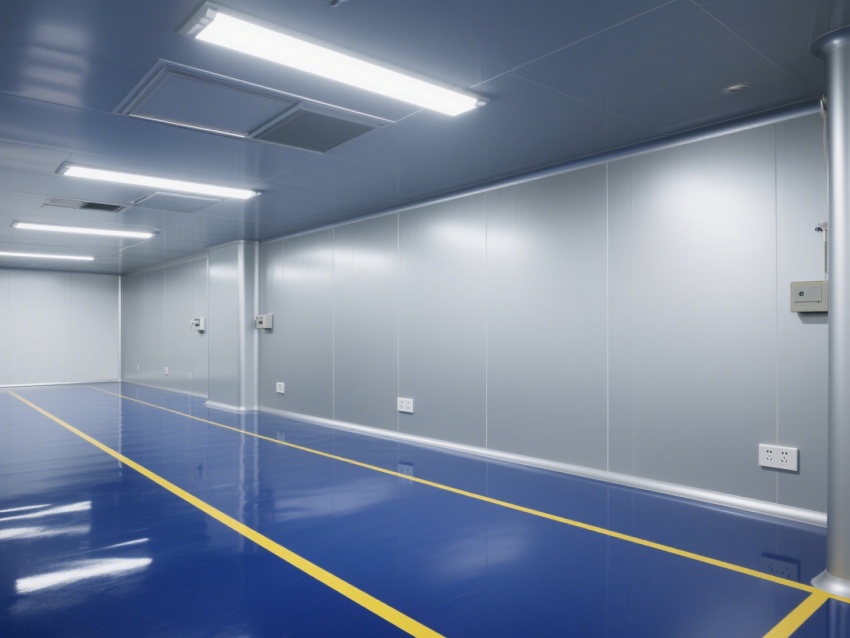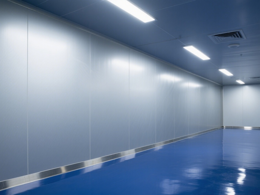 車間內(nèi)部整體呈銀灰色和藍(lán)色,給人一種現(xiàn)代感和科技感。墻面、地面和天花板均采用無(wú)縫設(shè)計(jì),便于清潔和消毒,防止灰塵和微粒的積聚。照明系統(tǒng)明亮且均勻,提供了良好的工作環(huán)境。