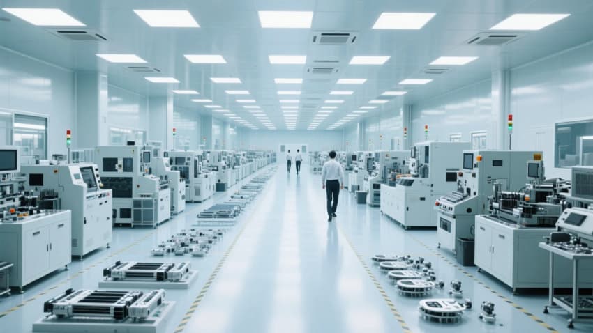 新能源無塵車間是一個(gè)高度專業(yè)化的生產(chǎn)環(huán)境,主要用于新能源產(chǎn)品的制造,例如鋰電池、太陽能電池板等。 車間內(nèi)部整體呈銀灰色和藍(lán)色,給人一種現(xiàn)代感和科技感