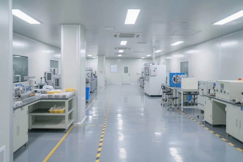 本工程嚴(yán)格遵循ISO14644-1Class7及GMP醫(yī)療器械生產(chǎn)規(guī)范,打造高標(biāo)準(zhǔn)的生物醫(yī)療器械制造環(huán)境。車間采用醫(yī)療級白色抗菌彩鋼板與淺藍(lán)防靜電環(huán)氧地坪的潔凈配色方