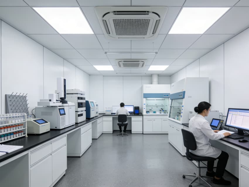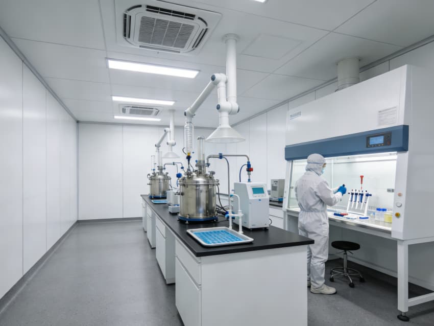 白色墻面采用食品級(jí)潔凈抗菌涂層,推行無縫拼接工藝,陰陽(yáng)角圓弧倒角設(shè)計(jì)消除清潔死角,潔凈度可達(dá)Class 7級(jí)標(biāo)準(zhǔn)。車間科學(xué)劃分抗體表達(dá)區(qū)、偶聯(lián)反應(yīng)區(qū)、純化區(qū)等功能區(qū)域,各區(qū)域配備獨(dú)立層流凈化與負(fù)壓防護(hù)系統(tǒng),偶聯(lián)區(qū)預(yù)留精密溫控與惰性氣體接口,純化區(qū)設(shè)置無菌物料傳遞窗口,全方位規(guī)避交叉污染,保障研發(fā)生產(chǎn)的安全性與合規(guī)性。
