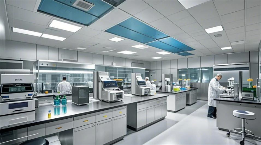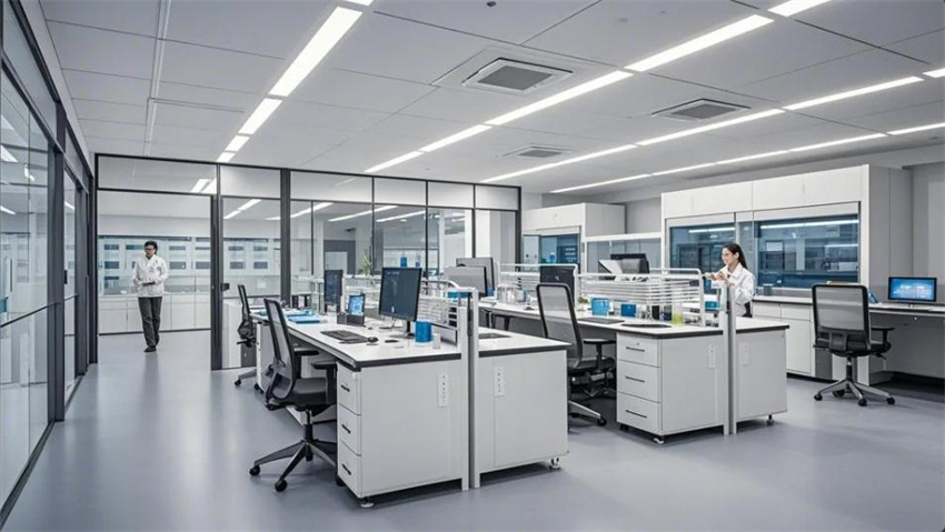 1000平方米生物實驗室整體裝修,現(xiàn)代科技風格,實驗室分為核心實驗區(qū)、設備區(qū)、樣品存儲區(qū)和辦公區(qū)。核心實驗區(qū)占50%,設備區(qū)占30%,樣品存儲區(qū)占10%,辦公區(qū)占10%。核心實驗區(qū):防靜電環(huán)氧地坪(淺灰色),白色彩鋼板墻面和天花板,頂部高效過濾器(HEPA),不銹鋼實驗臺,設備排列整齊。設備區(qū):精密儀器整齊排列,地面為防靜電PVC地板(淺色)。樣品存儲區(qū):冷藏柜和樣品架整齊,溫濕度控制。辦公區(qū):玻璃隔斷,現(xiàn)代簡約辦公桌。整體色彩:白色、淺灰色、科技藍點綴。