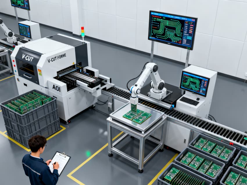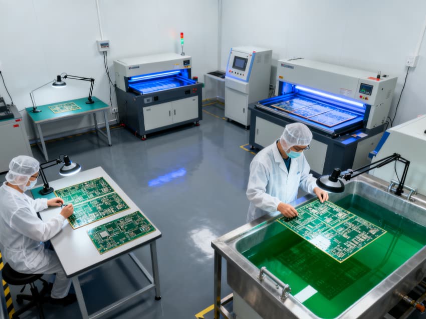 各車間功能定位清晰,適配全生產(chǎn)鏈路:基板裁切車間預(yù)留大型裁切設(shè)備安裝位,空間開(kāi)闊便于物料轉(zhuǎn)運(yùn);光刻車間采用密閉式布局,預(yù)留恒溫恒濕及避光系統(tǒng)接口;蝕刻車間強(qiáng)化通風(fēng)管道預(yù)留,適配酸堿試劑使用需求;鉆孔車間預(yù)留高精度鉆孔機(jī)安裝基礎(chǔ),地面做防震處理;阻焊車間側(cè)重潔凈防護(hù),預(yù)留噴涂設(shè)備工位;成型車間規(guī)劃物料緩存區(qū)與成品檢測(cè)區(qū);測(cè)試車間預(yù)留各類檢測(cè)儀器接口;包裝車間劃分潔凈包裝區(qū)與周轉(zhuǎn)區(qū)。