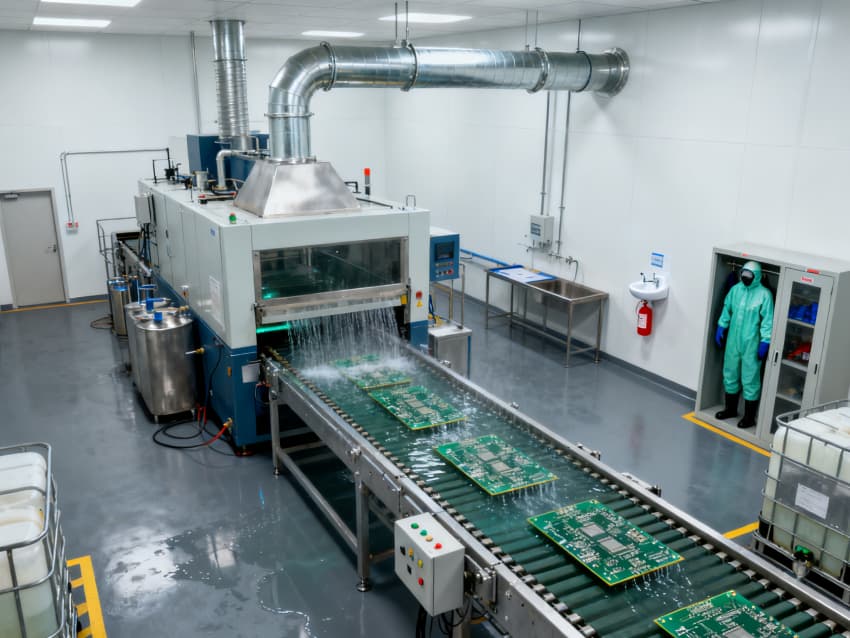 整體遵循電子制造潔凈標(biāo)準(zhǔn),風(fēng)格統(tǒng)一規(guī)整,地面采用灰色防靜電耐磨地坪,四周墻面為工業(yè)級(jí)白色潔凈涂層,精準(zhǔn)匹配PCB、FPC等各類電路板的全流程制造需求?;疑孛婢邆鋸?qiáng)抗靜電、耐化學(xué)腐蝕、易清潔特性,可有效規(guī)避靜電擊穿電路板元件風(fēng)險(xiǎn),耐受蝕刻、清洗等環(huán)節(jié)的試劑侵蝕,保障生產(chǎn)環(huán)境穩(wěn)定;白色墻面采用無(wú)縫拼接工藝,減少粉塵吸附與清潔死角,搭配嵌入式潔凈照明,為精密操作提供清晰視野。